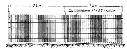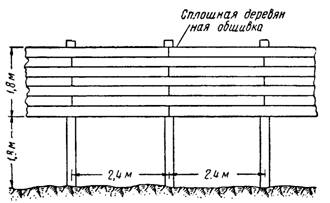 Металлические щиты обычно представляют собой металлические стойки, обшитые штампованными металлическими пластинками или проволочной сеткой. Металлические стойки забиваются в грунт, а в районах с сильными ветрами они, кроме того, закрепляются оттяжками. Металлические снеговые щиты устанавливаются наклонно под углом от 20 до 25° в наветренную сторону (рис. 4). Однако иногда щиты устанавливаются вертикально или с уклоном в подветренную сторону. В этих случаях щиты делаются сплошными, без просветов. В одной конструкции металлических снеговых щитов предусмотрена их установка секциями длиной 4,1 м, которые прикрепляются болтами к треугольным рамам, установленным с интервалом в 2,4 м одна от другой. Конструкция этих рам позволяет произвести простую разборку их и укладку в штабели. Постоянные снеговые заборы обычно устанавливаются на расстоянии не менее чем 30,5 м от оси пути. Желательно, чтобы снеговые заборы (рис. 5 и 6) одновременно служили и как изгороди на границе полосы отчуждения. В районах с суровым климатом и во всех случаях, когда заборы устанавливаются на расстоянии 15,2 м от оси пути, они делаются сплошными. В районах с умеренными снегопадами и в тех случаях, когда заборы устанавливаются не менее чем в 30,5 м от оси пути, они предпочтительно устраиваются с просветами в 50%. Высота заборов обычно не превышает 3,1 м.