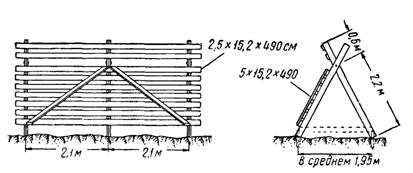 Мероприятия для защиты отдельных железнодорожных объектов от заноса снегом имеют не меньшее значение, чем быстрое удаление уже образовавшихся снежных заносов. Наилучшими средствами защиты железных дорог от снежных заносов являются живые защиты, переносные щиты, постоянные заборы и снеговые галереи. Снег при метелях переносится почти у самой земли и откладывается в выемках вследствие образующихся в них завихрений снеговетрового потока. Задачей снеговых заборов является искусственное образование таких завихрений с наветренной стороны выемок на таком расстоянии от них, чтобы снег мог откладываться в снежных валах, не попадая в выемки. При заборах достаточной высоты с небольшим количеством просветов снег накапливается с их наветренной стороны, а при заборах с большим количеством просветов снег откладывается в основном с их подветренной стороны. Как снегозащитное мероприятие стрелочные переводы при развитии путей следует размещать вне выемок; эффективным является уполаживание откосов выемок в снегозаносимых районах, особенно в тех случаях, когда грунты при таком уполаживании откосов могут быть использованы для отсыпки насыпей и планировки местности. Переносные снеговые щиты, имеющие наибольшее применение на дорогах, изготовляются из щитопланки, досок или металла. Широкое их применение связано с возможностью быстрой установки и перестановки практически в любых местах. Переносные снеговые щиты часто применяются как дополнение к постоянным заборам, когда последние уже не могут больше задерживать снег при сильных и продолжительных метелях или при перемене направления метелевого ветра. На полосе отчуждения, имеющей ширину 30,5 м, как правило, не хватает места для установки линии щитов на таком расстоянии от бровки выемки, которое обеспечило бы наилучшую работу снеговых щитов. Обычно бывает очень трудно получить разрешение на установку переносных снеговых щитов на оптимальном расстоянии от выемок для эффективного задержания снега. Переносные снеговые щиты должны быть прочно установлены и хорошо закреплены для предохранения от опрокидывания сильными порывами ветра. Весной щиты должны быть аккуратно собраны и уложены в штабеля в местах, где обеспечивалась бы их сохранность. Штабель со щитами должен быть установлен на подкладки, чтобы не происходило соприкосновения с землей во избежание загнивания древесины. Также должны быть предусмотрены противопожарные мероприятия. Ниже, на рис. 1—4, приведены типы снеговых щитов, рекомендованные AREA. Снеговые щиты из щитопланки обычно изготовляются из просушенных планок толщиной от 11 до 38 мм и длиной 1,2 м с просветами между ними в 5 см.